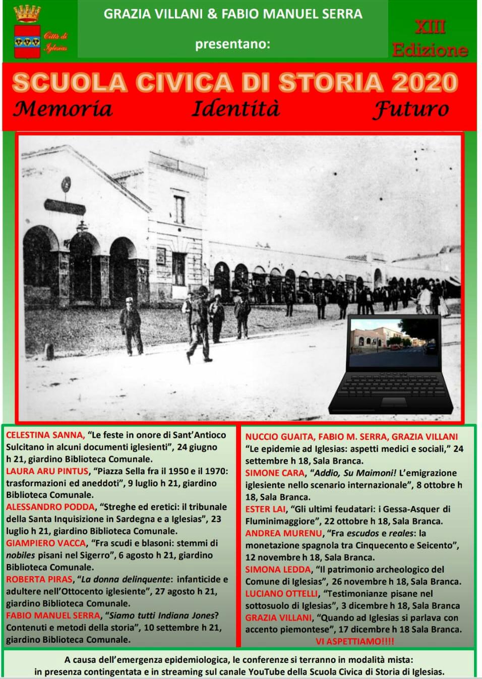 Su iniziativa della Professoressa Grazia Villani e del Dottor Fabio Manuel Serra, l’Assessorato alla Cultura del Comune di Iglesias comunica che, da mercoledì 24 giugno 2020, presso il giardino della Biblioteca Comunale "N. Canelles" in Via Diana, inizieranno gli incontri della XIII edizione della Scuola Civica di Storia, "Memoria, Identità, Futuro".